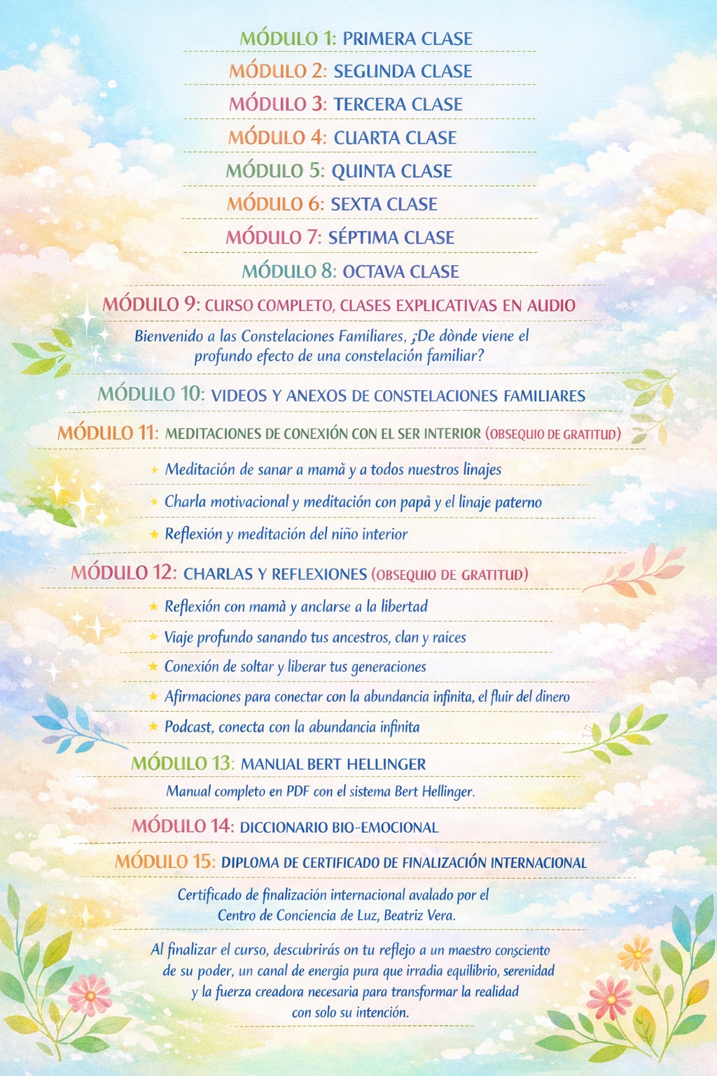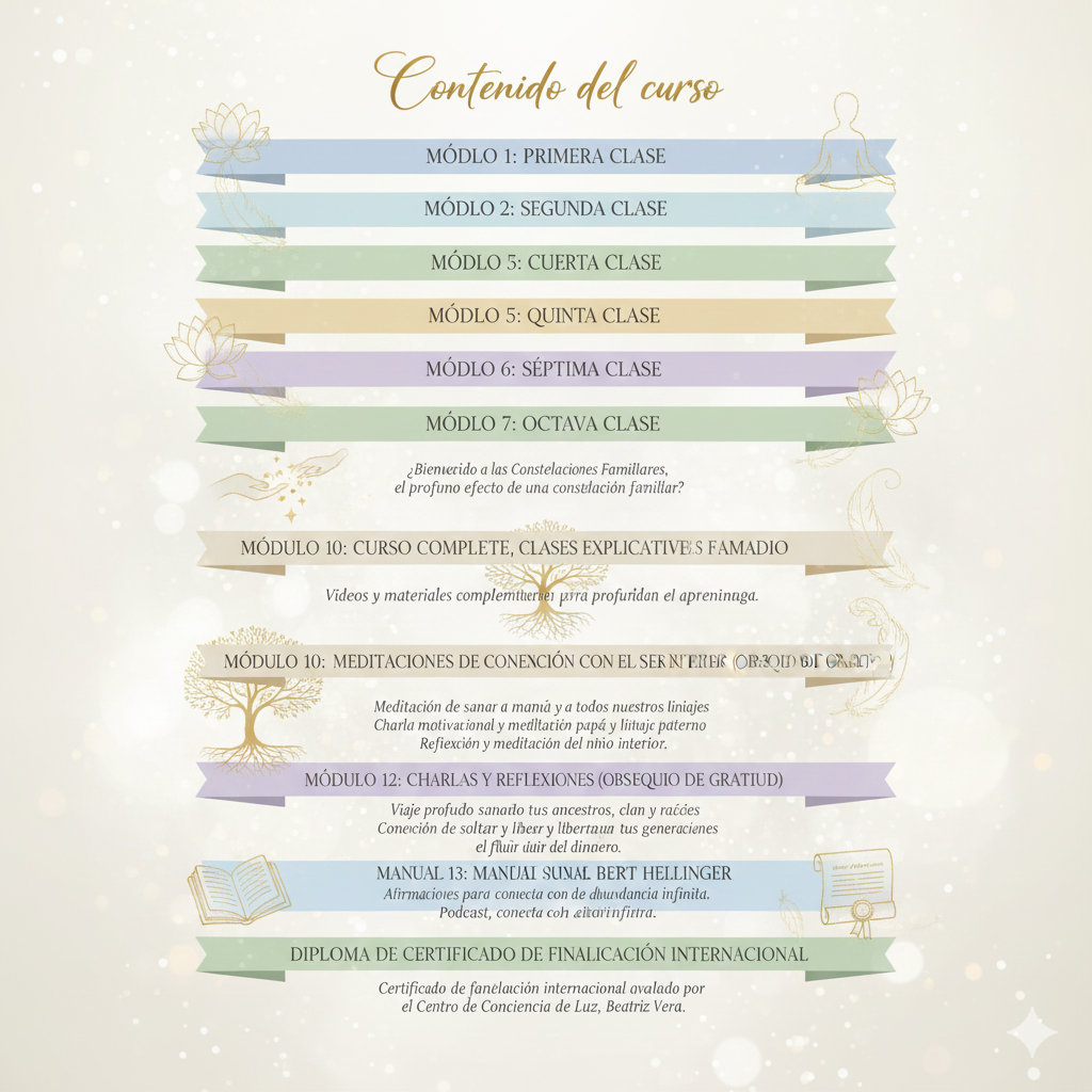 Porque esta formación es un proceso vivencial de transformación, donde aprenderás a liberar desde la raíz, comprender los vínculos invisibles que te habitan y convertirte en un canal de luz para otros, si así lo deseas.